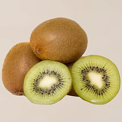 Kiwi is a small, brown, fuzzy fruit with bright green or golden flesh inside and tiny black edible seeds. It has a sweet and slightly tangy flavor.