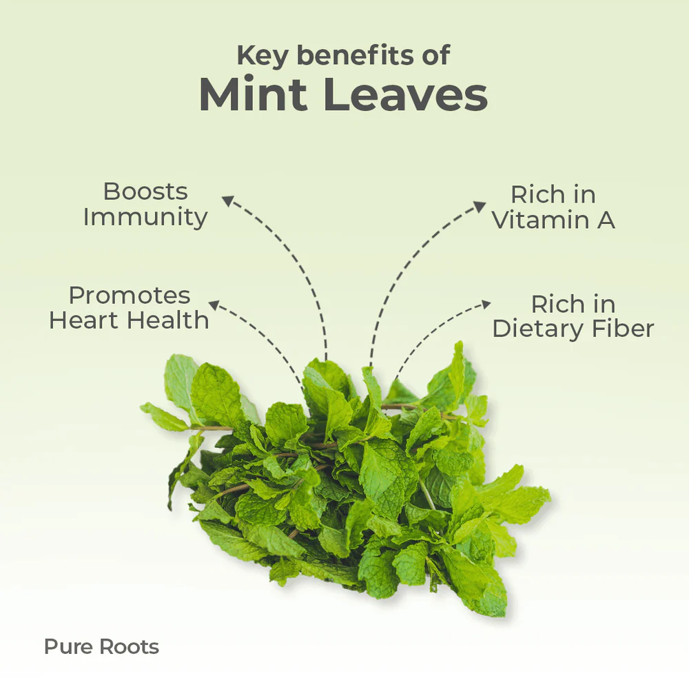 Mint (Pudina) is a fragrant green herb known for its cooling aroma and refreshing flavor. It has bright green serrated leaves and grows in clusters from underground stems called rhizomes.