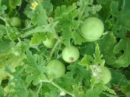 The Tinda plant is a spreading vine with broad, rough-textured leaves and yellow flowers.